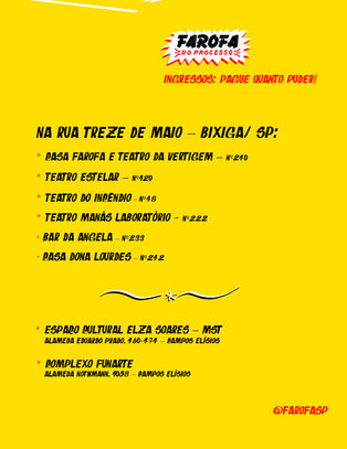 Now, Farofa adds territoriality to its recipe. Celebrating one year of Casa Farofa's existence, the 2026 edition takes over Bixiga, starting at Rua 13 de Maio, distributing its program across five cultural spaces - Casa Farofa, Teatro da Vertigem, Teatro Manás Laboratório, the headquarters of the Estelar de Teatro company, Teatro do Incêndio, bars, and even the home of one of the neighborhood's residents. Thus, we invite artists, audiences, and residents of the region to think of Bixiga as a territory of permanence and transit, of encounter and flow, an area to live in and frequent in its plurality: in encounter, in conviviality, in celebration, and in creativity.